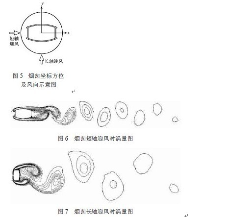 首先对方柱绕流和圆柱绕流进行了数值模拟, 得到计算域的涡量图, 所得横风向气动参数与文[ 6], [ 7] 数据吻合较好, 验证了本文方法的可靠性。在此基础上,对烟囱进行了非定常风场数值模拟, 获得了烟囱各典型剖面的升力系数和斯脱罗哈数。